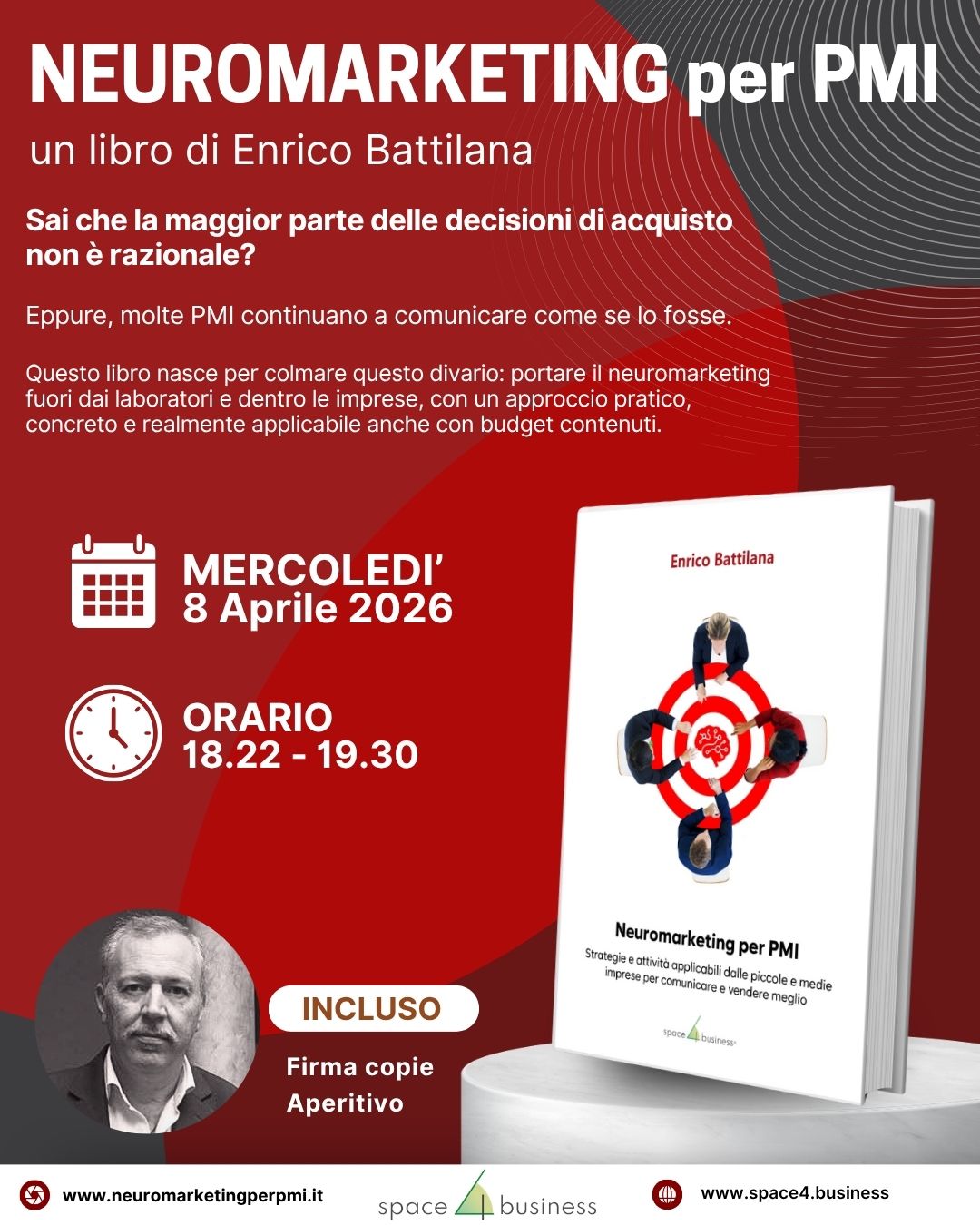 Non perdetevi la presentazione del quarto volume di Space4Business 📗, “Neuromarketing per PMI”, il libro di Enrico Battilana verrà presentato l’8 aprile dalle 18.00 alle 19.00 📅; ci sarà il firma copie e un rinfresco per [continua…]